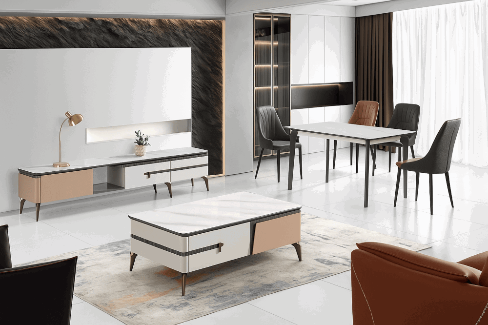 إذا كنت ترغب في مظهر متكامل ومتناغم، فإن طقم طاولات مستطيلة هو الخيار الأمثل. يتألف هذا الطقم عادة من عدة طاولات بأحجام مختلفة تتناسق في الشكل واللون والتصميم، ما يمنح الغرفة وحدة بصرية أنيقة. يمكن توزيع طقم طاولات مستطيلة في غرفة المعيشة أو حتى في المجلس ليمنح المساحة طابعًا فخمًا ومنظمًا.هذه الطاولات غالبًا تأتي بتصميمات حديثة تضيف لمسة فنية، وبعضها مزود بدرجات مختلفة من الارتفاع لتناسب مختلف الاستخدامات اليومية.